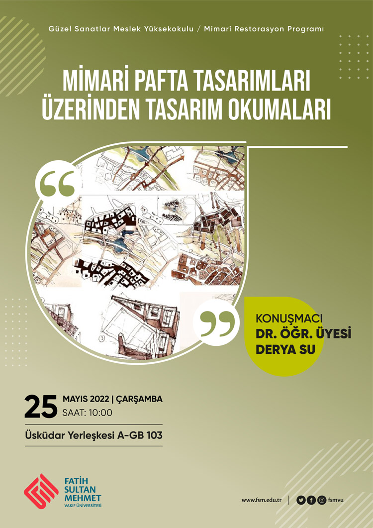 Güzel Sanatlar Meslek Yüksekokulu Mimari Restorasyon Programının düzenlediği “Mimari Pafta Tasarımları Üzerinden Tasarım Okumaları” konferansı Dr. Öğr. Üyesi Derya Su tarafından 25 Mayıs’ta gerçekleşecektir.